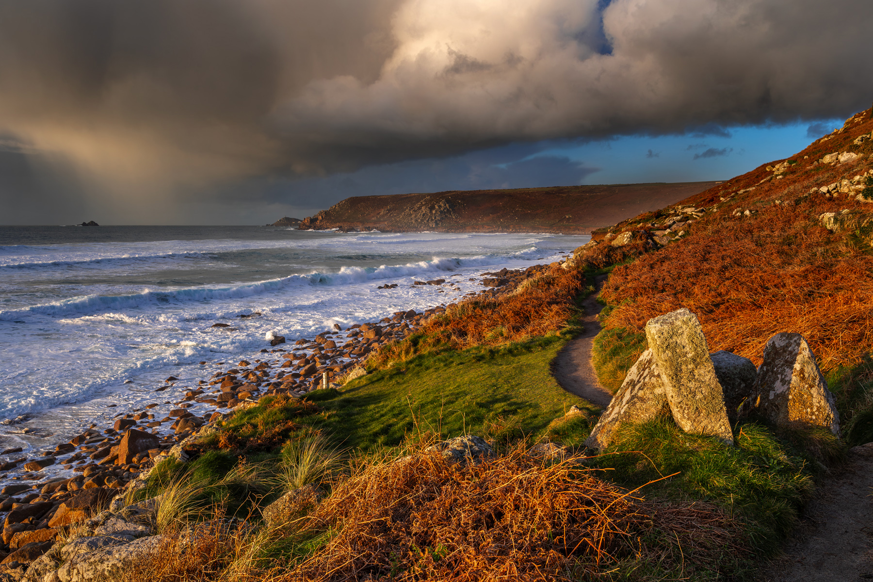 cloned out a few people from the beach!). The remaining photos were taken from the headland of Pedn-men-an-mere and show Porth Chapel Beach and Wolf Rock lighthouse as the sun neared the horizon. The sky was very dramatic. |