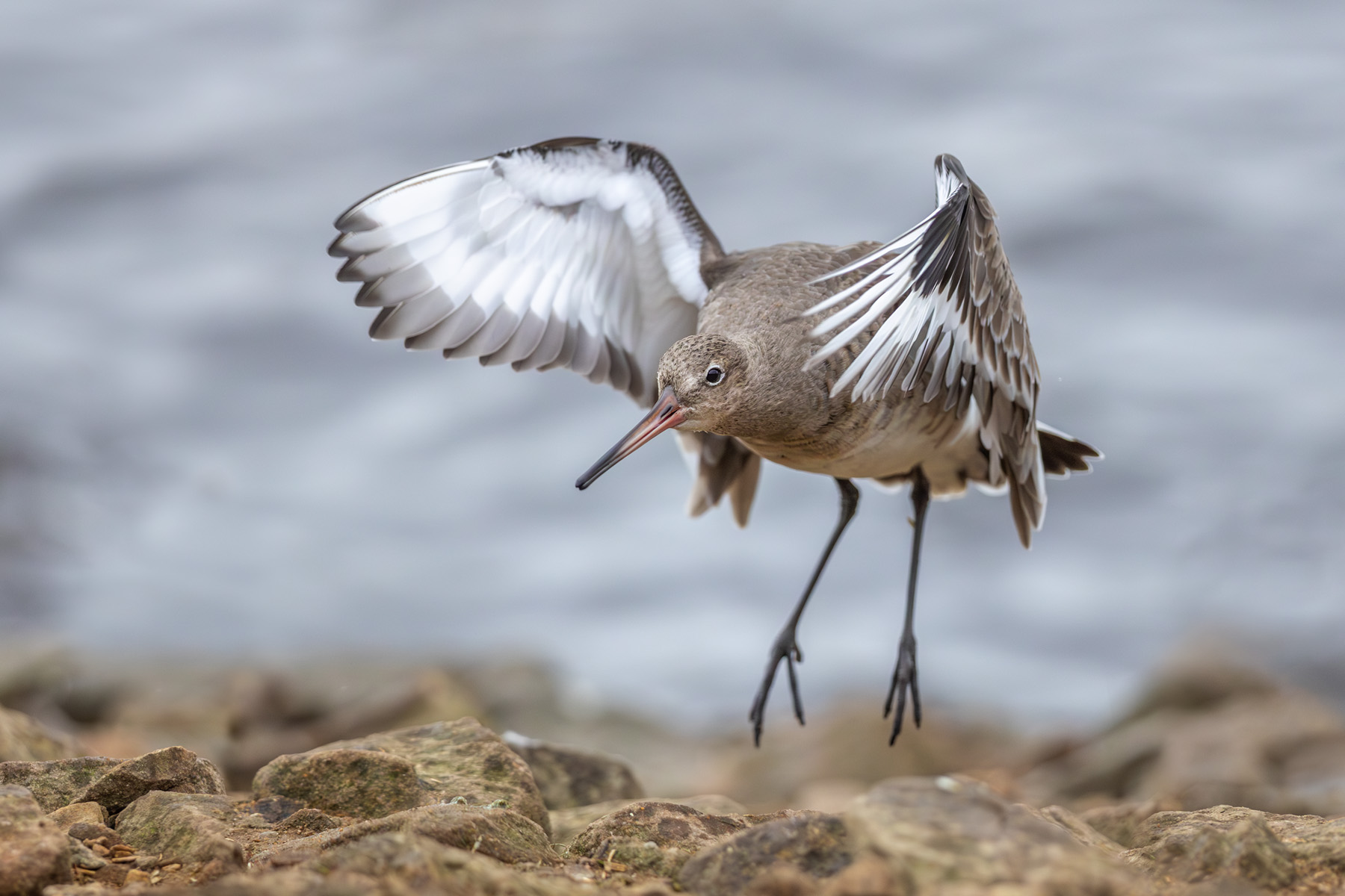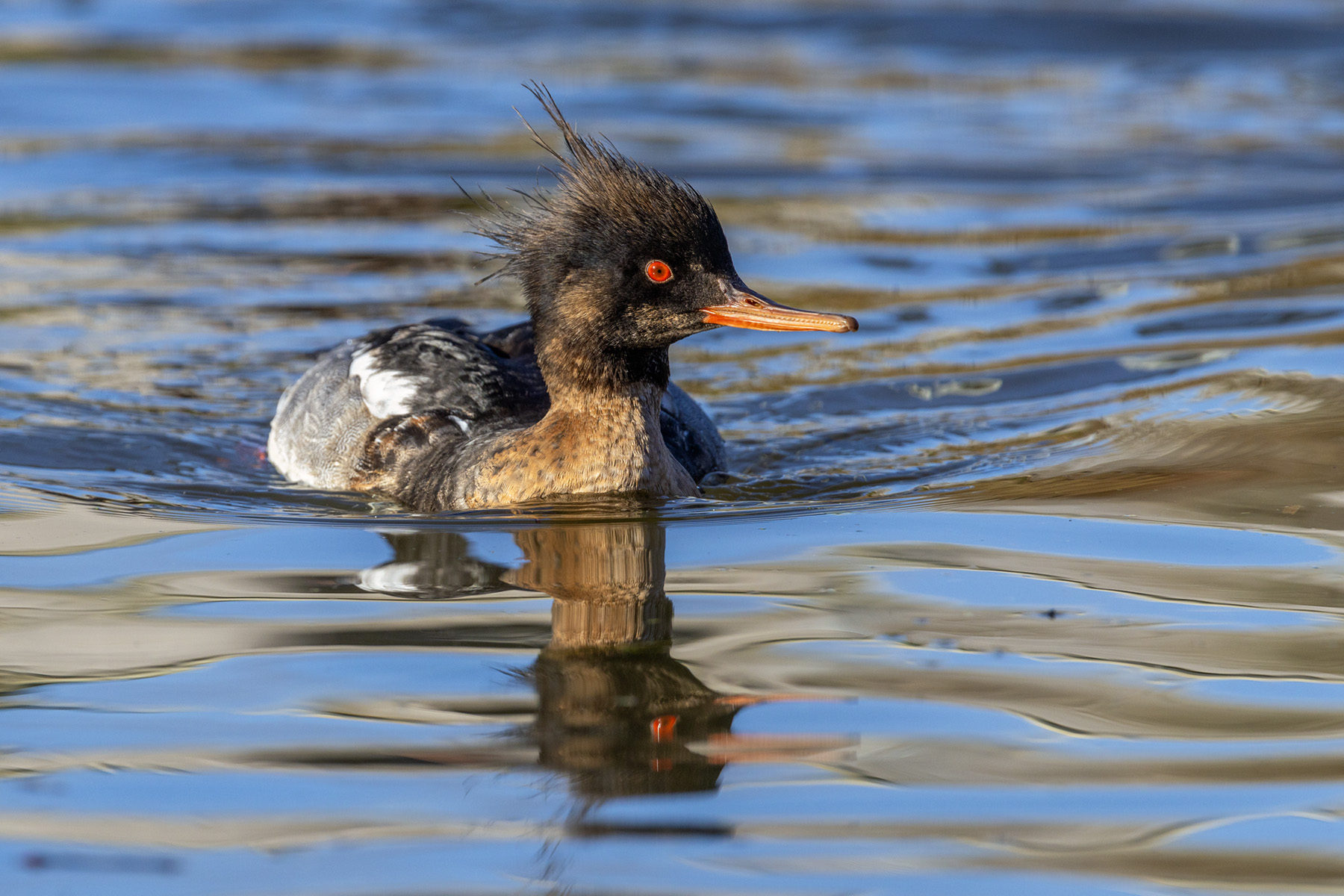 red breasted merganser (male); black-tailed godwit flying in to land;