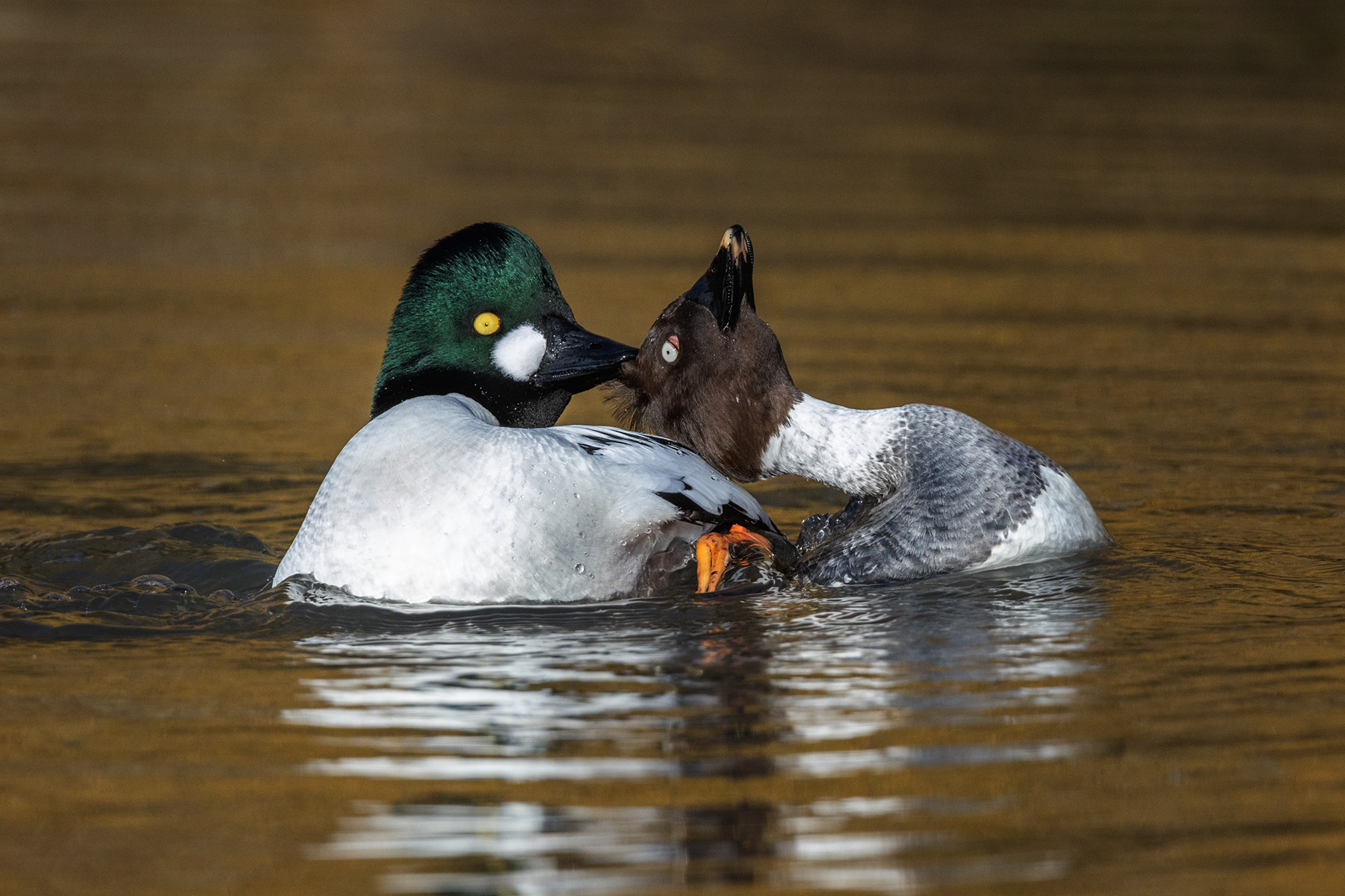 left they show: shelduck male in flight; goldeneyes just after mating;