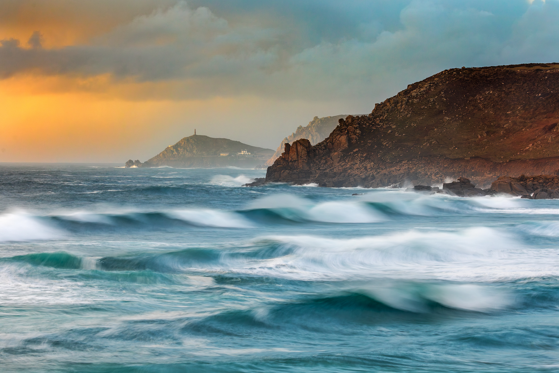 cloned out a few people from the beach!). The remaining photos were taken from the headland of Pedn-men-an-mere and show Porth Chapel Beach and Wolf Rock lighthouse as the sun neared the horizon. The sky was very dramatic. |