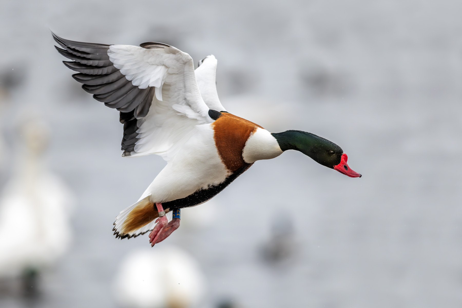 left they show: shelduck male in flight; goldeneyes just after mating;